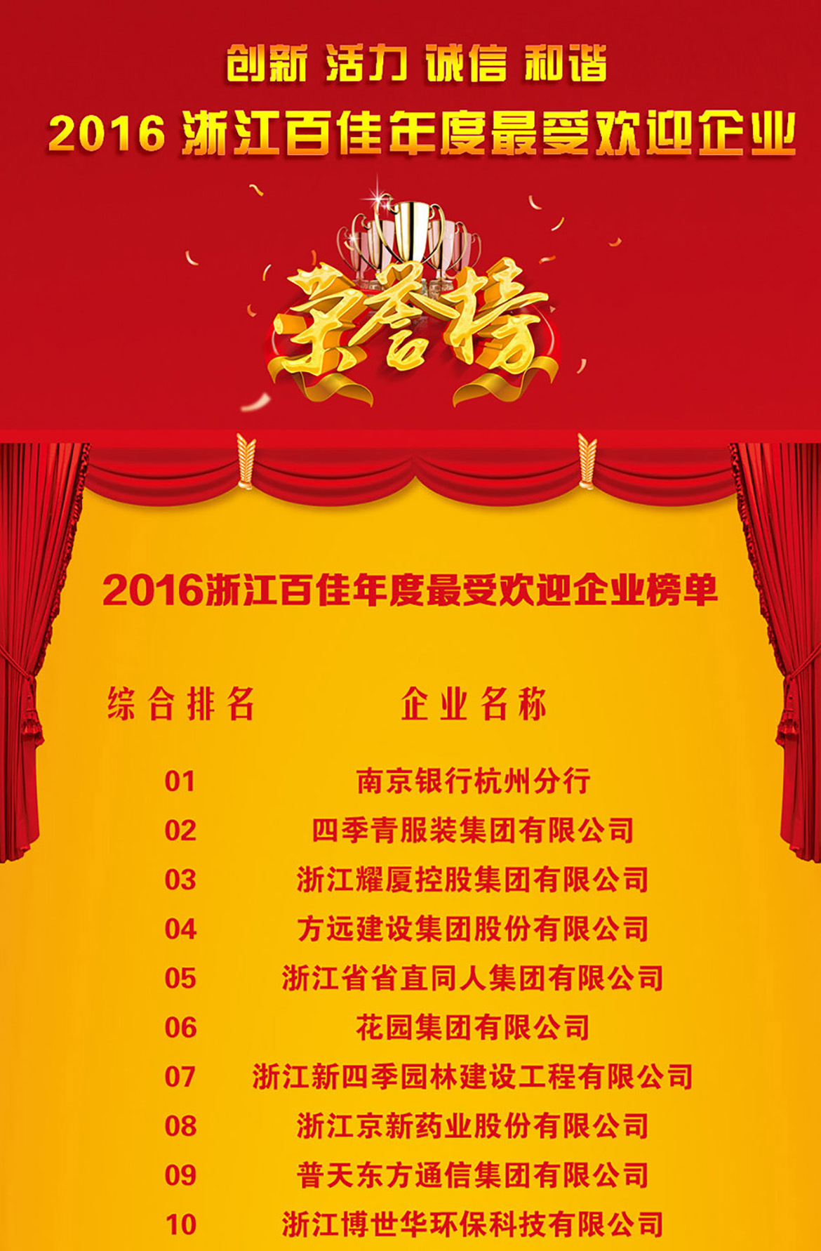 为推动浙江省企业的诚信和谐经营,增添企业的创新发展活力和动力,由浙江经济网、新华网浙江频道主办,由中共浙江省委政法委员会、浙江省人大内务司法委员会、浙江省人民检察院、浙江省科学技术厅、浙江省公安厅、浙江省环境保护厅、浙江省住房和城乡建设厅、浙江省国家税务局、浙江省政协经济委员会、浙江省总工会、新华网等单位指导,于2016年12月联合举办的“2016浙江百佳年度最受欢迎企业” 荣誉榜推选活动日前揭晓,我公司在众多参评企业中脱颖而出,取得了第十名的佳绩。