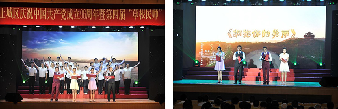 为迎接党的96岁生日,2017年6月30日上午,由中共杭州市上城区委员会主办的上城区庆祝中国共产党成立96周年暨第四届“草根名师”讲堂在上城区政府3楼大礼堂隆重举行。区委对先进基层党组织、优秀共产党员、优秀党务工作者进行了表彰,整台盛会通过《担当职责》、《奉献之美》、《向你看齐》与《创新之力》四个篇章,弘扬了普通党员甘于奉献、全心全意为人民服务的崇高精神。