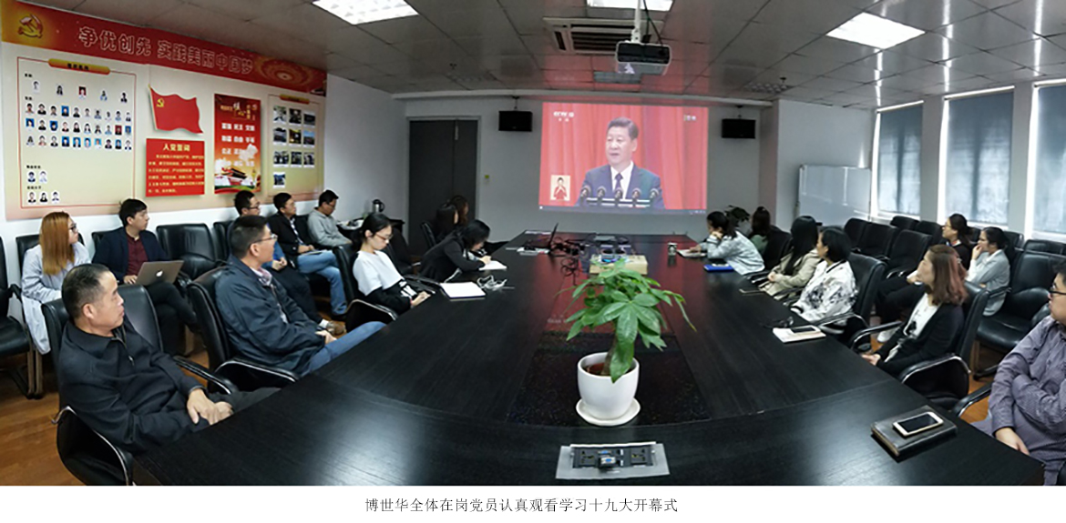博世华全体党员在会议室准时观看了十九大开幕式,因工作原因未能出席的员工也在项目现场或以其他方式准时收看学习。