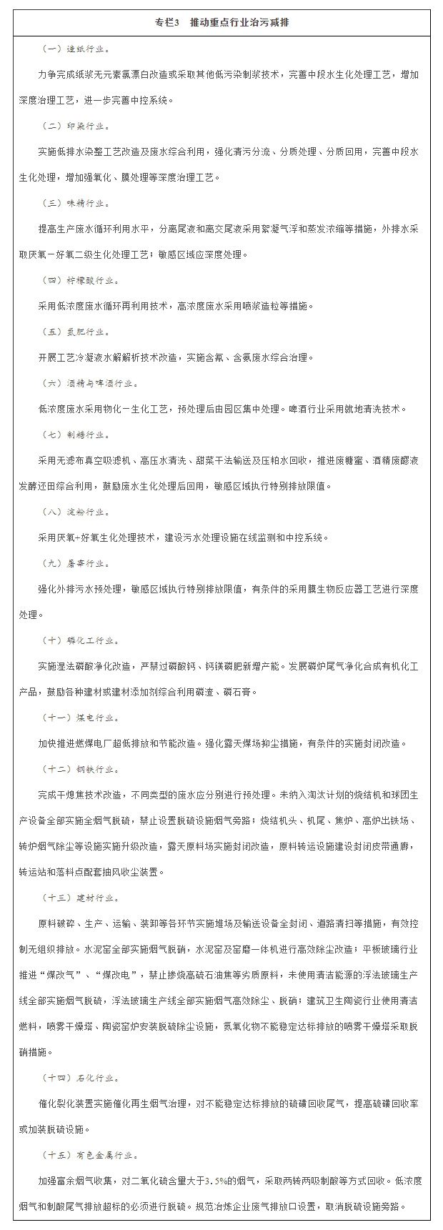 推动治污减排工程建设。各省(区、市)要制定实施造纸、印染等十大重点涉水行业专项治理方案,大幅降低污染物排放强度。电力、钢铁、纺织、造纸、石油石化、化工、食品发酵等高耗水行业达到先进定额标准。以燃煤电厂超低排放改造为重点,对电力、钢铁、建材、石化、有色金属等重点行业,实施综合治理,对二氧化硫、氮氧化物、烟粉尘以及重金属等多污染物实施协同控制。各省(区、市)应于2017年底前制定专项治理方案并向社会公开,对治理不到位的工程项目要公开曝光。制定分行业治污技术政策,培育示范企业和示范工程。
