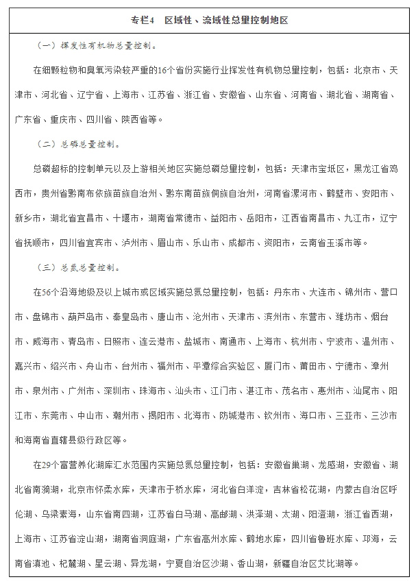 控制重点地区重点行业挥发性有机物排放。全面加强石化、有机化工、表面涂装、包装印刷等重点行业挥发性有机物控制。细颗粒物和臭氧污染严重省份实施行业挥发性有机污染物总量控制,制定挥发性有机污染物总量控制目标和实施方案。强化挥发性有机物与氮氧化物的协同减排,建立固定源、移动源、面源排放清单,对芳香烃、烯烃、炔烃、醛类、酮类等挥发性有机物实施重点减排。开展石化行业“泄漏检测与修复”专项行动,对无组织排放开展治理。各地要明确时限,完成加油站、储油库、油罐车油气回收治理,油气回收率提高到90%以上,并加快推进原油成品油码头油气回收治理。涂装行业实施低挥发性有机物含量涂料替代、涂装工艺与设备改进,建设挥发性有机物收集与治理设施。印刷行业全面开展低挥发性有机物含量原辅料替代,改进生产工艺。京津冀及周边地区、长三角地区、珠三角地区,以及成渝、武汉及其周边、辽宁中部、陕西关中、长株潭等城市群全面加强挥发性有机物排放控制。