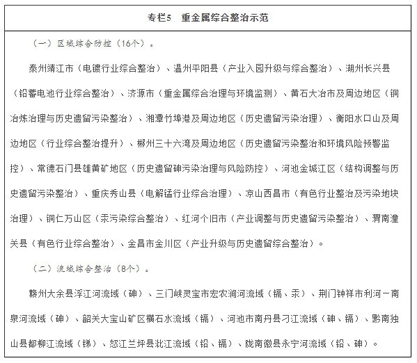 深化重点区域分类防控。重金属污染防控重点区域制定实施重金属污染综合防治规划,有效防控环境风险和改善区域环境质量,分区指导、一区一策,实施差别化防控管理,加快湘江等流域、区域突出问题综合整治,“十三五”期间,争取20个左右地区退出重点区域。在江苏靖江市、浙江平阳县等16个重点区域和江西大余县浮江河流域等8个流域开展重金属污染综合整治示范,探索建立区域和流域重金属污染治理与风险防控的技术和管理体系。建立“锰三角”(锰矿开采和生产过程中存在严重环境污染问题的重庆市秀山县、湖南省花垣县、贵州省松桃县三个县)综合防控协调机制,统一制定综合整治规划。优化调整重点区域环境质量监测点位,2018年底前建成全国重金属环境监测体系。